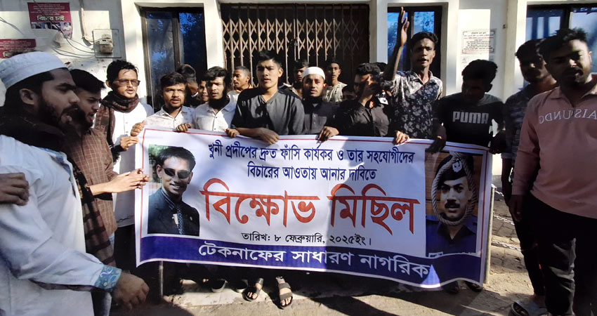 সেনাবাহিনীর অবসরপ্রাপ্ত মেজর রাশেদ মোহাম্মদ সিনহা হত্যাকাণ্ডে ফাঁসির দণ্ডপ্রাপ্ত আসামি সাবেক ওসি প্রদীপ কুমার দাসের দ্রুত ফাঁসি কার্যকর ও তার সহযোগীদের বিচারের আওতায় আনার দাবিতে বিক্ষোভ মিছিল করেছে কক্সবাজারের টেকনাফের
